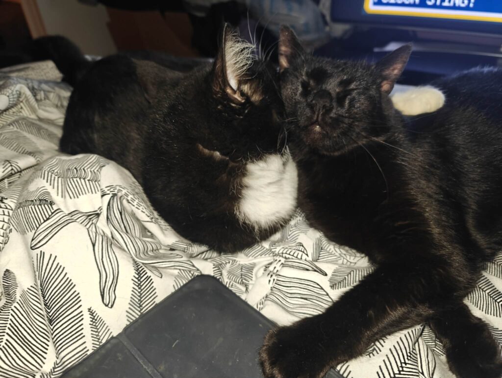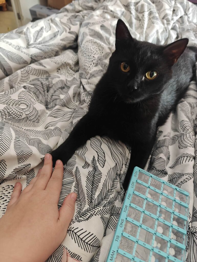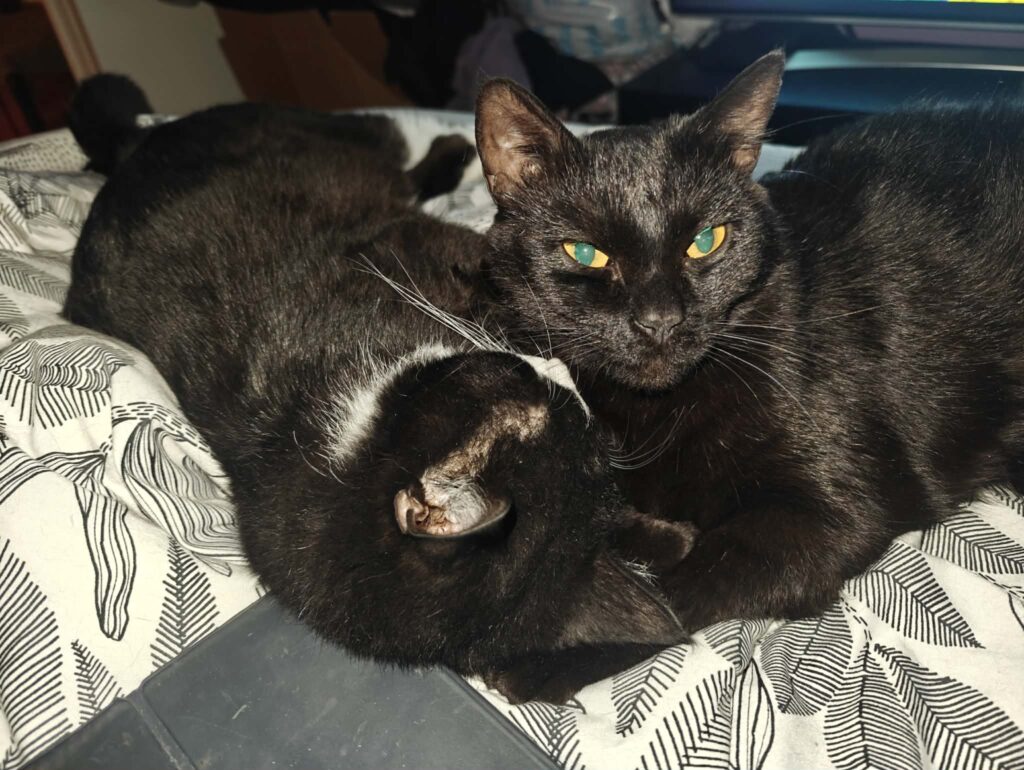 När hon läkt från operationen öppnade vi sakta upp till den andra jourkatten då det märktes att Lilith inte trivdes med att vara själv. Hon blev kär i Kakan vid första ögonkastet. Så snart hon fick fri tillgång till hela övervåningen har hon blommat ut något rejält.